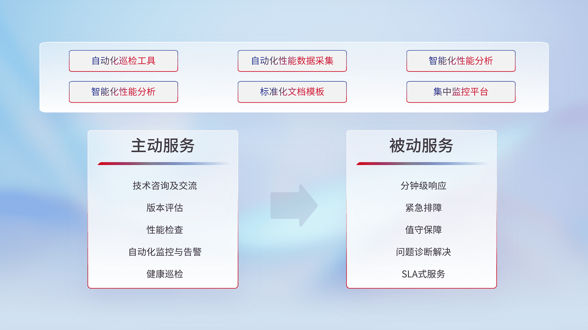 智能化工具和标准化文档,,,,保障服务质量,,,提供主动服务(包含技术咨询、、、、版本评估、、性能检查、、、自动化监控与告警、、、、健康巡检)和被动服务包含(分钟级响应、、紧急排障、、、、值守保障、、问题诊断解决、、、、SLA服务)。。。